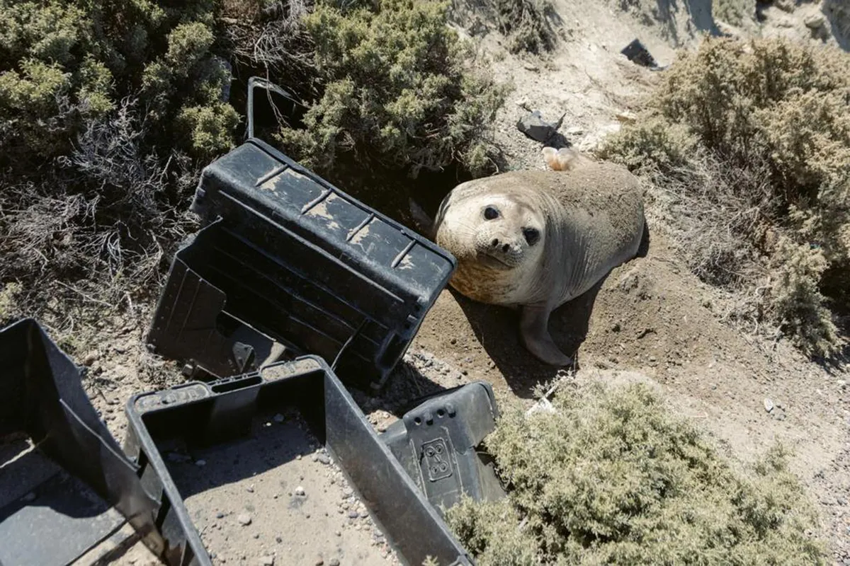 Recientemente se volvieron virales imágenes que muestran la costa de Península Valdés con elefantes marinos rodeados de cajones plásticos. Estos desechos, entre los que se encuentran baldes, pallets y cajones de madera, redes, botas, entre otros residuos plásticos, provienen de la industria pesquera que se desarrolla mar adentro frente al litoral de la provincia de Chubut.